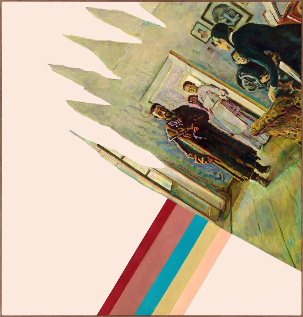 But, simultaneously, we are talking about the encounter of realistic and abstract images. Both are positioned in a "floating" position relative to the painting’s vertical and horizontal axes. The tension is created by presenting the fragment of realistic painting in an inclined diagonal position, thereby violating its "normal" orientation of top and bottom. The viewer has a choice: Should they consider what was seen by Repin (and was only a “painting”) to be reality, or is this just empty space in which the scraps of their memories are floating around?