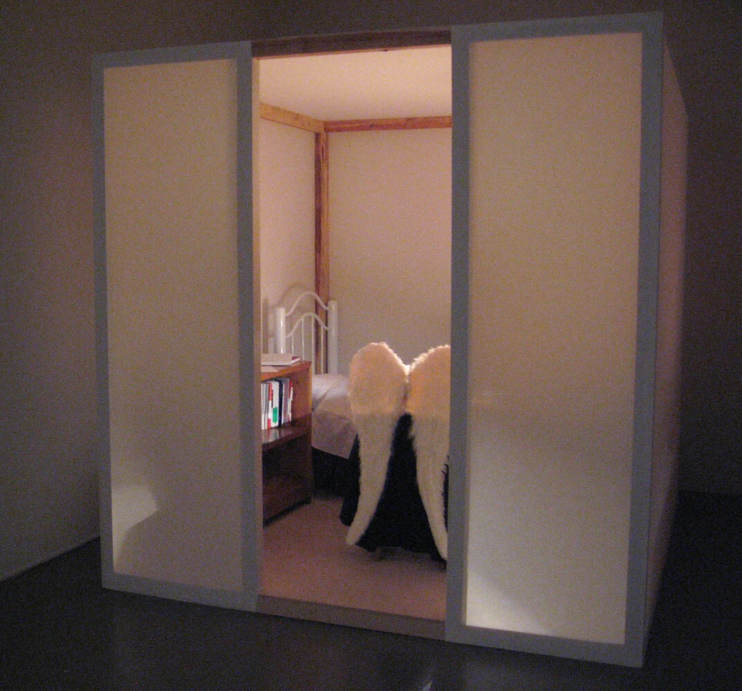 I made two wings out of white fabric and used leather belts to attach the wings to my back. After isolating myself and locking my door, I put on the wings. First, I spend ten minutes attending to my usual occupations. Two hours later, I take the wings off. I then repeat the procedure in the evening.